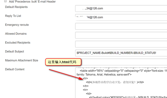 11. Default Content:自定义邮件通知的默认内容主体。该选项能在邮件的内容中替换一些参数,这样你就可以在构建中包含指定的输出信息。